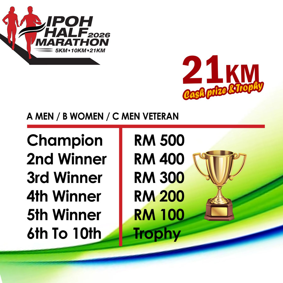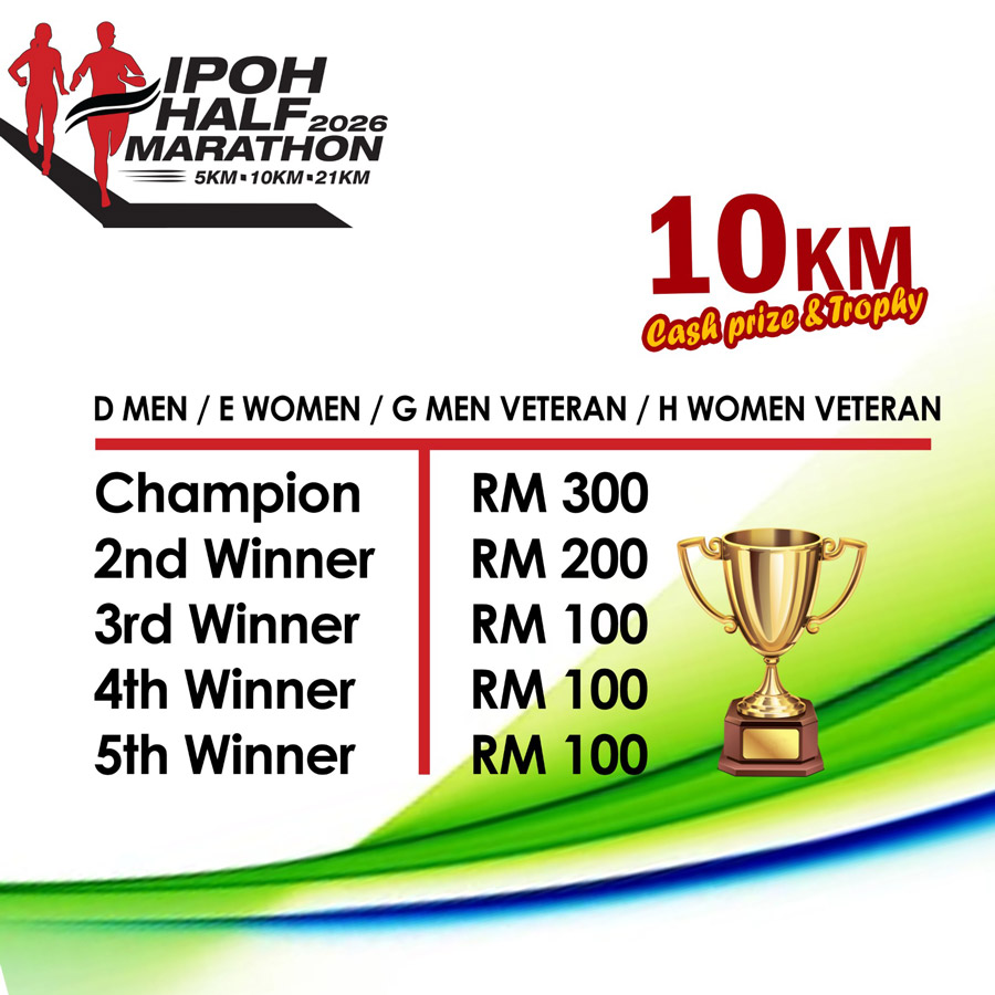 D: 10km Men Open (13yrs and above) E: 10km Women Open (13yrs and above) G: 10km Men Veteran (40yrs & above) H: 10km Women Veteran (40yrs & above) (10km) Fees shown is SUBJECT to Admin Fee & RM3 Insurance Fee