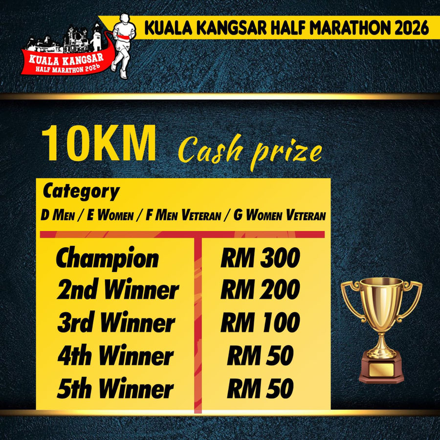 E: 10km Women Open (13yrs & above) F: 10km Men Veteran (45yrs & above) G: 10km Women Veteran (40yrs & above) (10km) Fees is SUBJECT to Admin Fee and RM3 Insurance Fee
