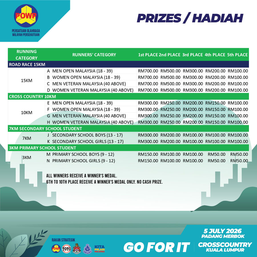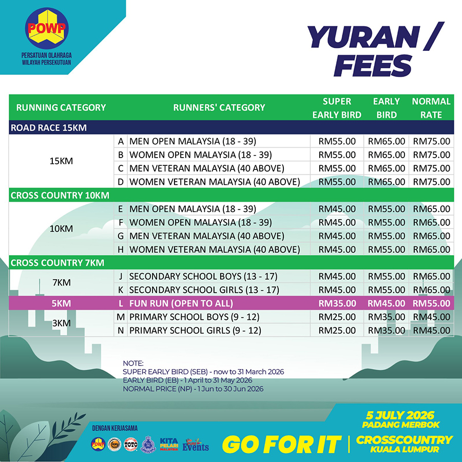 J: 7km Secondary School Boys (13-17yrs) K: 7km Secondary School Girls (13-17yrs) (7km ) Fees is SUBJECT to Admin Fee and RM3 Insurance Fee