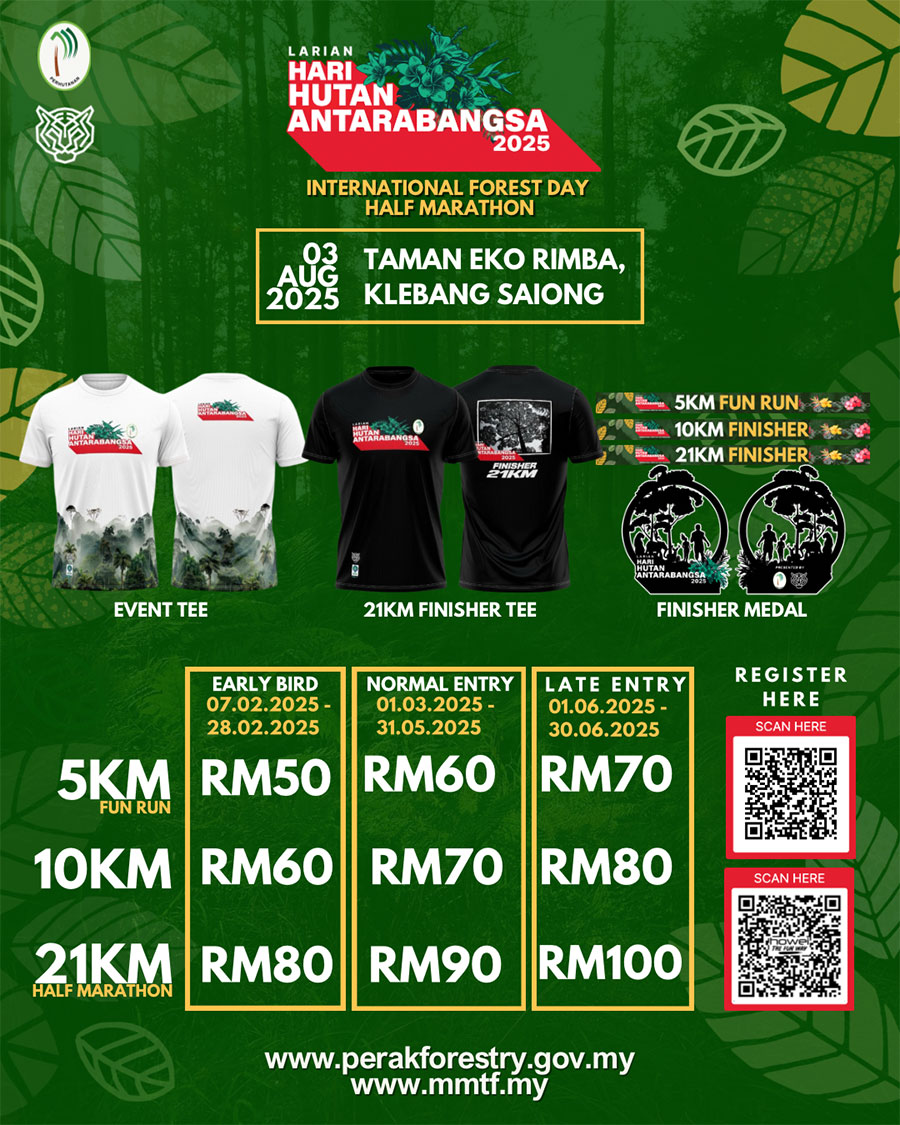 Larian Hari Hutan Antarabangsa 2025 is a ROAD RACE presented to you by Jabatan Perhutanan Negeri Perak and MMTF Consultant. The event is set to take place on May 18, 2025, at Taman Eko Rimba Kledang Saiong, Ipoh, Perak in conjunction with the International Day of Forests. Larian Hari Hutan Antarabangsa 2025 is divided into 3 categories, namely 5KM Fun Run,10KM and 21KM.