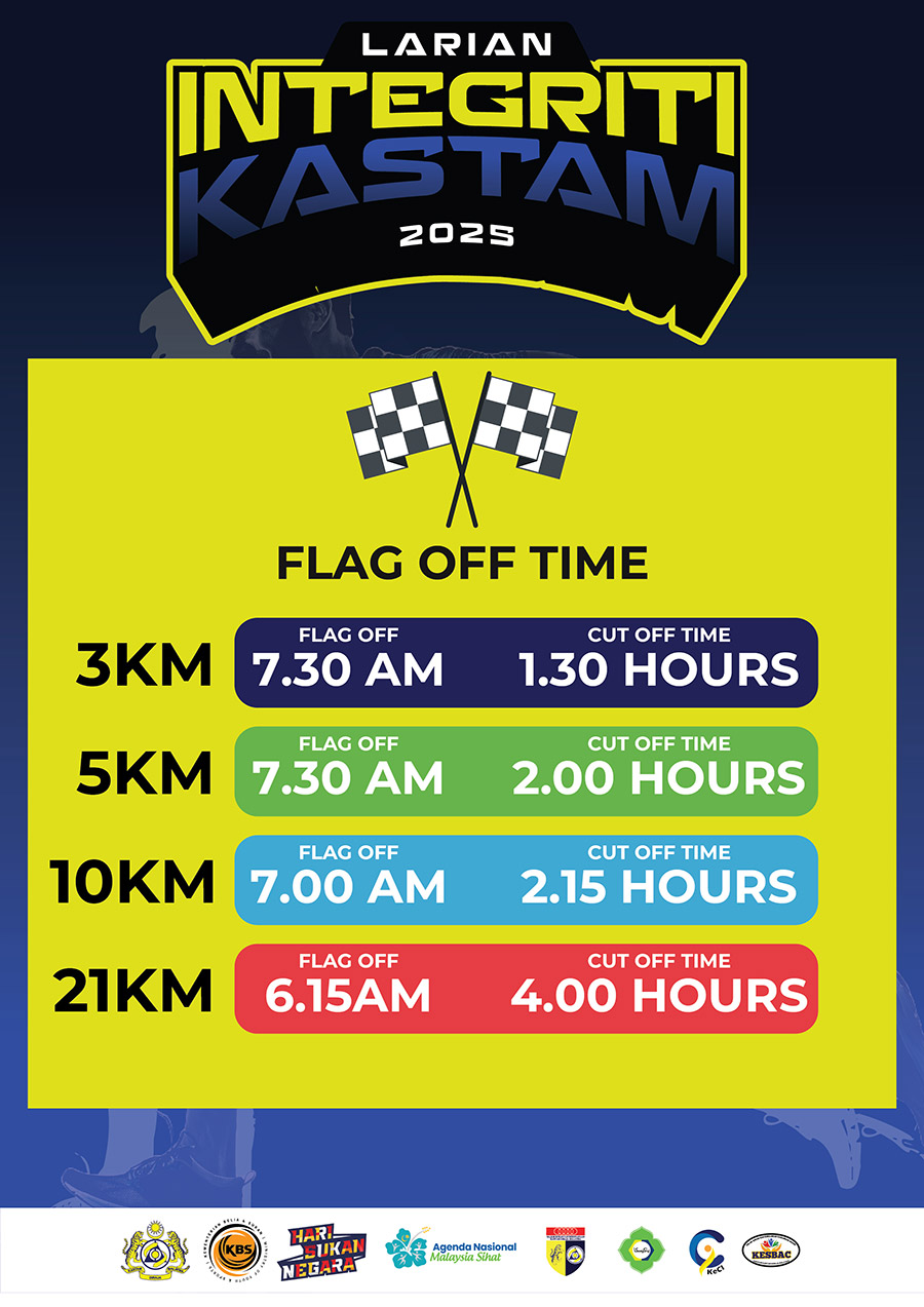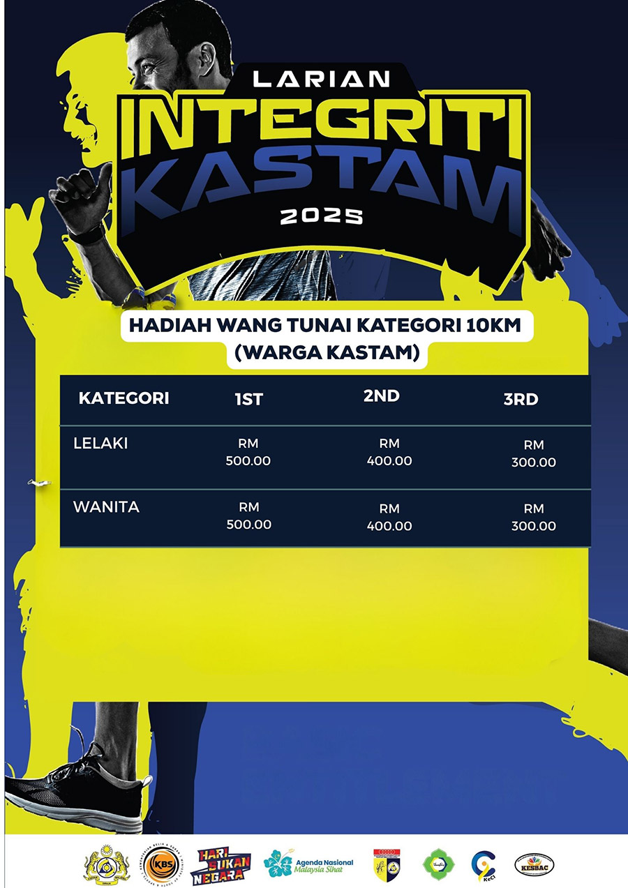 Jabatan Kastam Diraja Malaysia berbesar hati menjemput anda untuk menyertai Larian Integriti Kastam 2025, sebuah acara larian yang bukan sahaja menguji stamina tetapi juga memperkukuh nilai integriti dalam kalangan masyarakat.