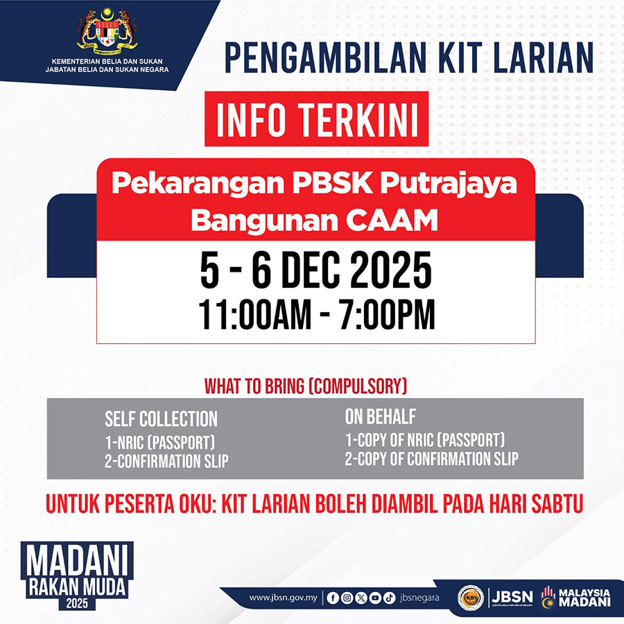 Bersempena Program Rancakkan Madani Bersama Malaysiaku yang berlangsung pada 5–7 Disember 2025, ayuh kita sama-sama turun padang memeriahkan Larian Madani Rakan Muda pada 7 Disember 2025!