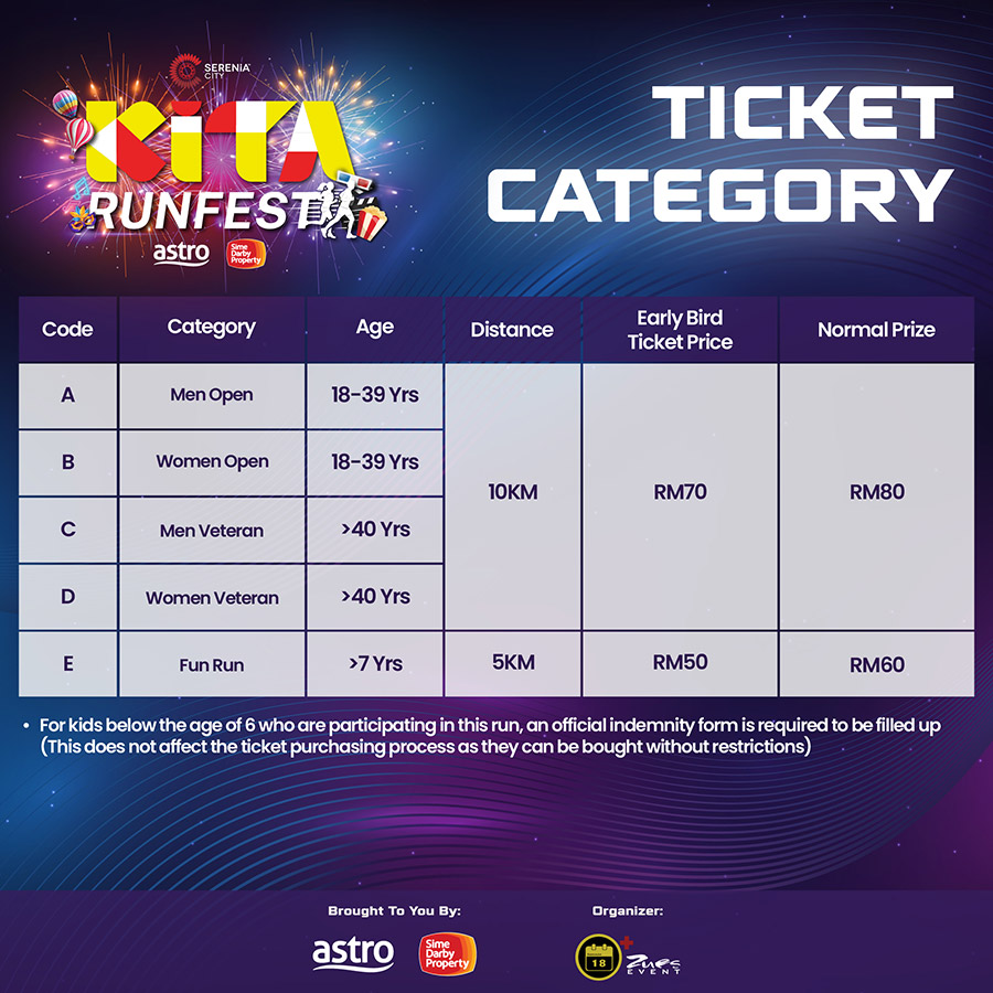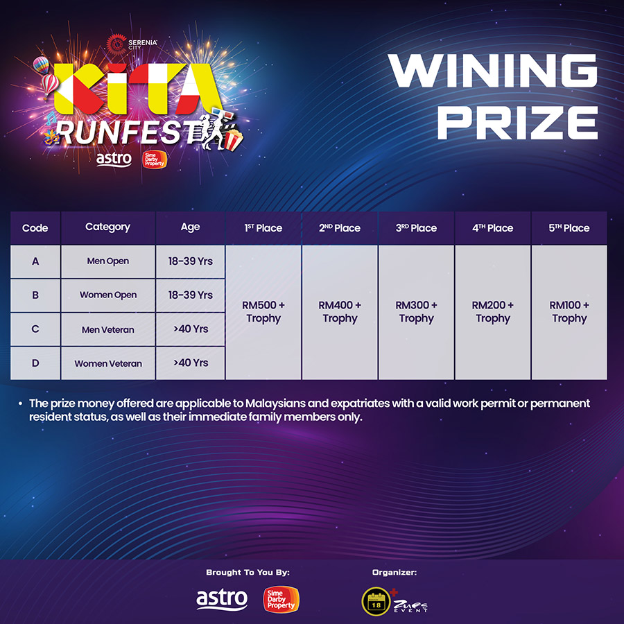 D: 10km Women Veteran (40yrs & above) (10km) Fees is subject to Admin Fee and RM3 Insurance Fee.