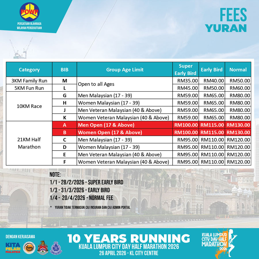 B: 21km Women Open (17yrs and above) (21km) Fees is SUBJECT to Admin Fee and RM4 Insurance per participant