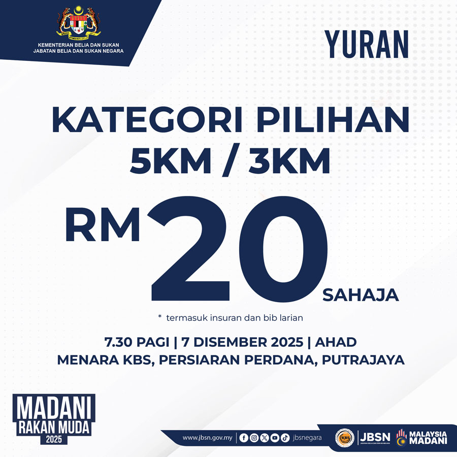 Bersempena Program Rancakkan Madani Bersama Malaysiaku yang berlangsung pada 5–7 Disember 2025, ayuh kita sama-sama turun padang memeriahkan Larian Madani Rakan Muda pada 7 Disember 2025!